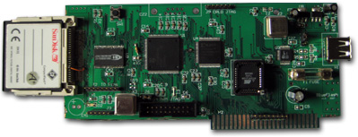 This amazing piece of hardware allows data (such as disk images) to be transferred from a host machine to an Apple II via Bluetooth (wirelessly) and executed as if running from an actual Apple Disk ][ 5.25″ floppy drive. Vinchysky, the clever man behind this project who began the BlueFlash effort three years ago, achieved this by fully implementing Woz’s ingenious Disk ][ controller card in a Xilinx FPGA, driven by an on-board, 57MHz ARM7 processor. Communications are achieved by way of a standard PC bluetooth dongle plugged into the board’s single USB connector. Disk images can be executed from a flash card inserted in the board’s compact flash slot, or from the board’s 512K of SRAM (acting as dual drives) after direct transfer via Bluetooth from a host computer.