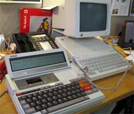 The PX-8 is a great little machine. It weighs 5 lbs, features an 80-character by 8-line LCD display with angle adjustment, is powered by a Z-80 compatible CMOS CPU, runs CP/M 2.2 out of ROM and runs for 15 hours per charge. It comes with several extremely basic apps on-board (including BASIC, actually), and additional programs can be added by way of pop-in ROM chips or via floppy, if you’re fortunate enough to have gotten your hands on an elusive FP-10 floppy drive. Epson sold the PX-8 for $999 back in its day.
